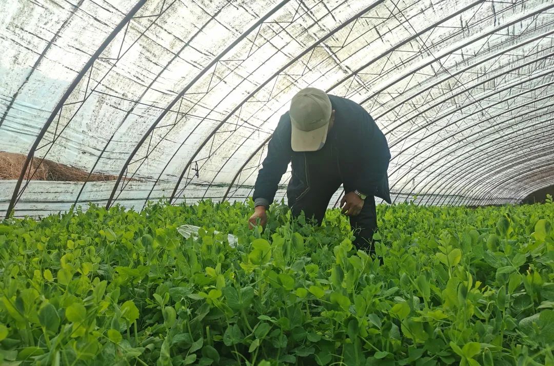 农户正在采豌豆尖。艾里非热 摄喀什市色满乡副乡长王正帅说:“我乡充分发挥资源优势,积极调整农业产业结构,因地制宜发展各类蔬菜种植,使蔬菜种植成为振兴农村产业、带动村民增收的重要力量,帮助农户获得更好的收益。”(喀什市融媒体中心记者:艾里非热 努尔麦麦提)