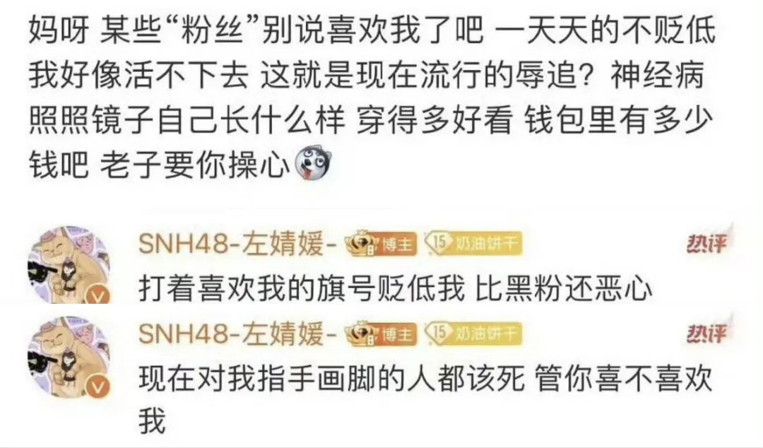 先是SNH48的左婧媛在微博发文,透露自己遭到某些自称粉丝的人过度批评,终于忍无可忍斥责“辱追粉”。