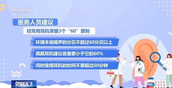 医务人员建议,经常用耳机掌握3个“60”原则,即环境本底噪声的分贝不超过60分贝,佩戴耳机建议音量要小于它的60%,同时使用耳机的时间不要超过60分钟。出现持续耳鸣 或是听力衰退的先兆