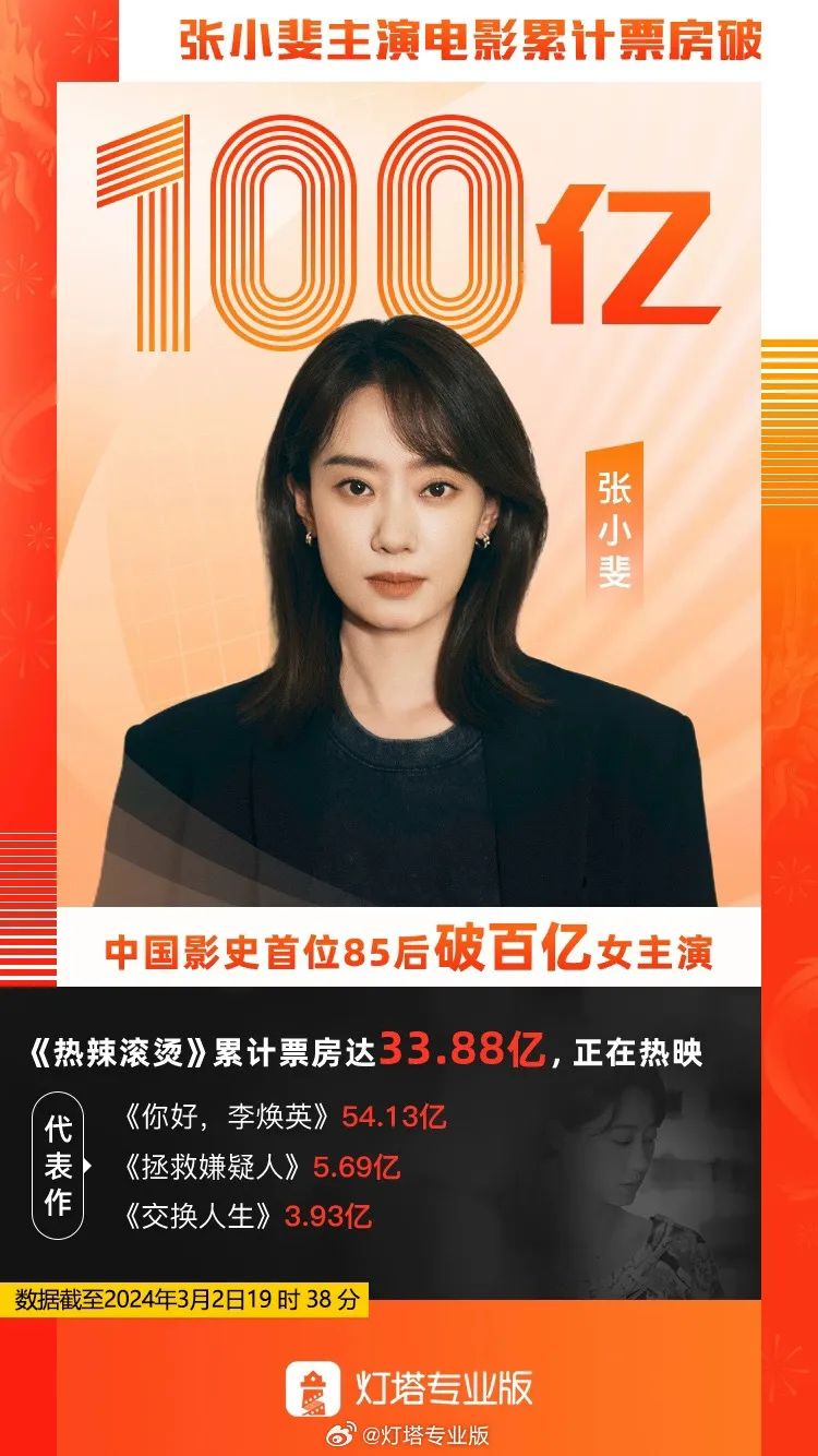 据灯塔专业版数据显示,截至3月2日19:38,演员张小斐主演电影票房突破100亿,成为中国影史首个主演电影票房突破百亿的85后女演员。
