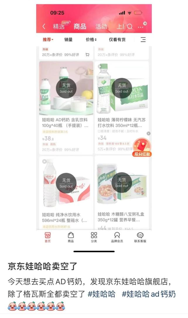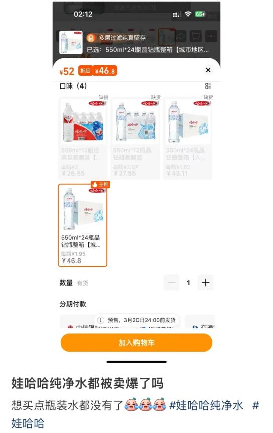 面对订单的明显增加,3月1日,娃哈哈社交平台官方旗舰店发布公告称:近期得到大家无数的关心与支持,店铺订单量明显增加,公司安排了更多同事打包发货,请大家耐心等待,等不及的家人可申请退款退货。没能让大家有更好的服务体验,娃哈哈深表歉意,也建议大家理性消费,按需购买。