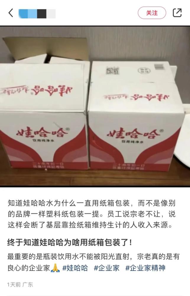 “娃哈哈水一直用纸箱包装,而不是用塑料纸包装一提。员工说宗老不让,因为这样会断了靠捡纸箱维持生计的人收入来源。”