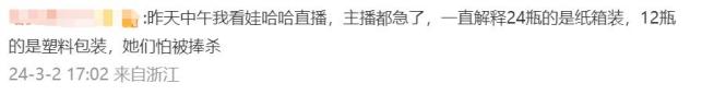 3月2日,娃哈哈回应客服称,饮用水包装是根据数量的多少有区分,12瓶装的纯净水是裹膜包装,24瓶装的是纸箱包装,产品品质都一样,只是规格不同。
