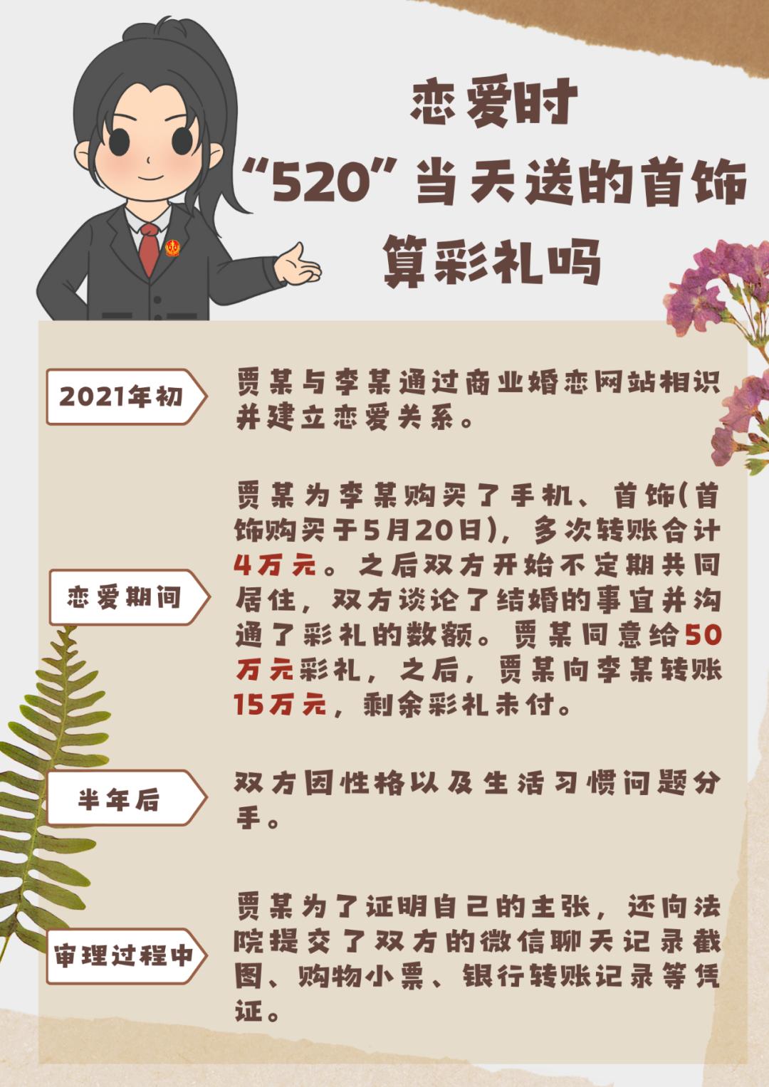 法 院 审 理法院认为,贾某为李某购买的手机以及转账的4万元系恋爱关系中贾某为增进感情进行的日常消费性支出,不属于彩礼;贾某为李某购买的首饰在特殊时点购买,属于表达或增进感情的消费性支出,亦不属于彩礼;贾某向李某转账的15万元,时间发生在双方沟通彩礼数额之后,性质也曾由双方明确认可为彩礼,因此,可以认定15万元为贾某为达到与李某结婚的目的而给付的部分彩礼。