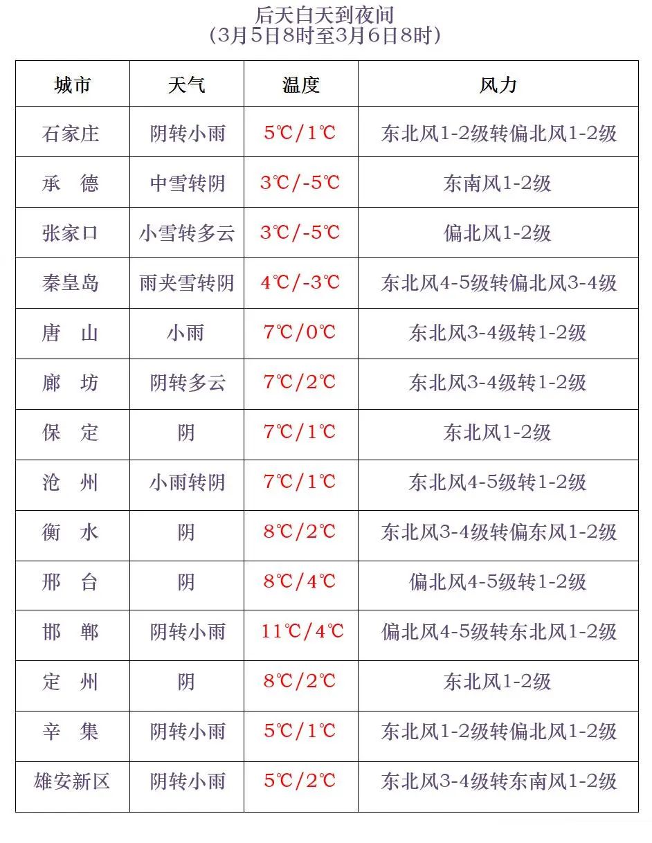 明天夜间到5日,全省阴,张家口、承德北部、保定西北部有小到中雪;承德南部、唐山、秦皇岛有小雨或雨夹雪转中雪;保定中南部、雄安新区、廊坊、石家庄、沧州、邢台西部、邯郸西部有小雨或雨夹雪。5日白天,渤海海域和沿海地区有东北风4到5级,阵风6到7级。