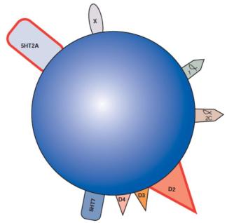 本药是5-HT2A和D2受体拮抗剂,对受体的拮抗作用与典型药物氟哌啶醇相似,此外还表现出对α1和α2受体的高亲和性,对β受体和M受体的亲和性较低。