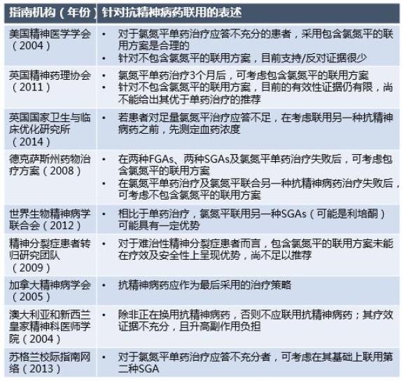 目前,抗精神病药单一用药仍是精神分裂症治疗的主流。基于现有证据,包含氯氮平和阿立哌唑的抗精神病药联用方案拥有相对较好的证据;其中,氯氮平针对精神分裂症尤其是难治性患者的疗效有目共睹,联用该药的主要目的在于进一步提高疗效,如利培酮+氯氮平;阿立哌唑的代谢副作用相对较轻,甚至可能降低血催乳素水平,联用该药的主要目的在于改善其他抗精神病药的相关副作用,如奥氮平+阿立哌唑。