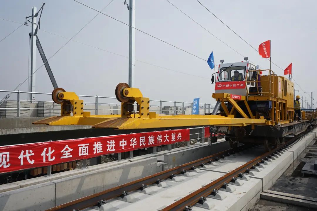 沪苏湖铁路全线铺轨总长450公里,铺设道岔209组,沿途穿越河流湖泊较多,地形地质地貌复杂,铺轨施工具有邻近营业线施工多、作业精度要求高、铺轨工期紧、安全风险大等特点。为确保铺轨施工安全、优质、高效推进,项目建设管理单位上海铁路枢纽工程建设指挥部组织施工单位中铁二局精心编制长钢轨运输及铺轨方案,严把技术标准和安全质量,采用2组铺轨机同时铺轨,高峰期将有800人同时作业,单日最高可铺设轨道12公里。沪苏湖铁路计划今年6月底完成全线铺轨施工,随后转入静态验收、联调联试阶段,预计今年年底具备开通运营条件。