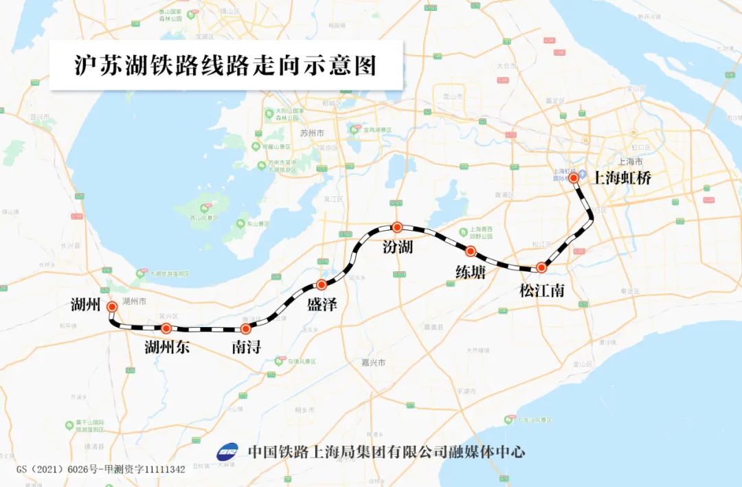 沪苏湖铁路由上海虹桥站引出,途经江苏省苏州市,终至浙江省湖州市湖州站,线路全长163.8公里,设计时速350公里,全线设上海虹桥、松江南、练塘、苏州南(汾湖)、盛泽、南浔、湖州东、湖州站等8个车站。