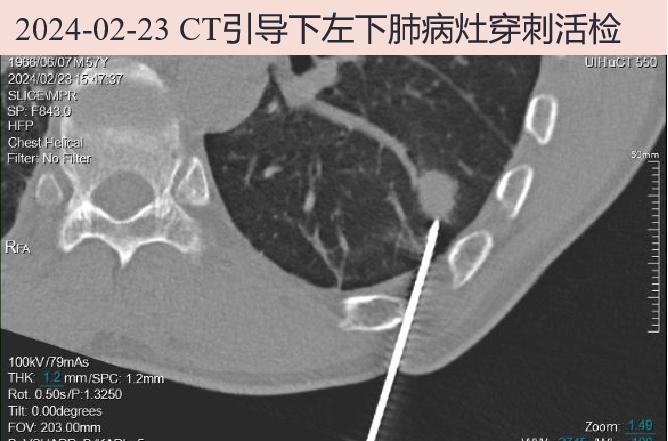 2024-02-23 左下肺结节病灶考虑肿瘤性病变不排除,故经CT引导下左下肺病灶穿刺活检。
