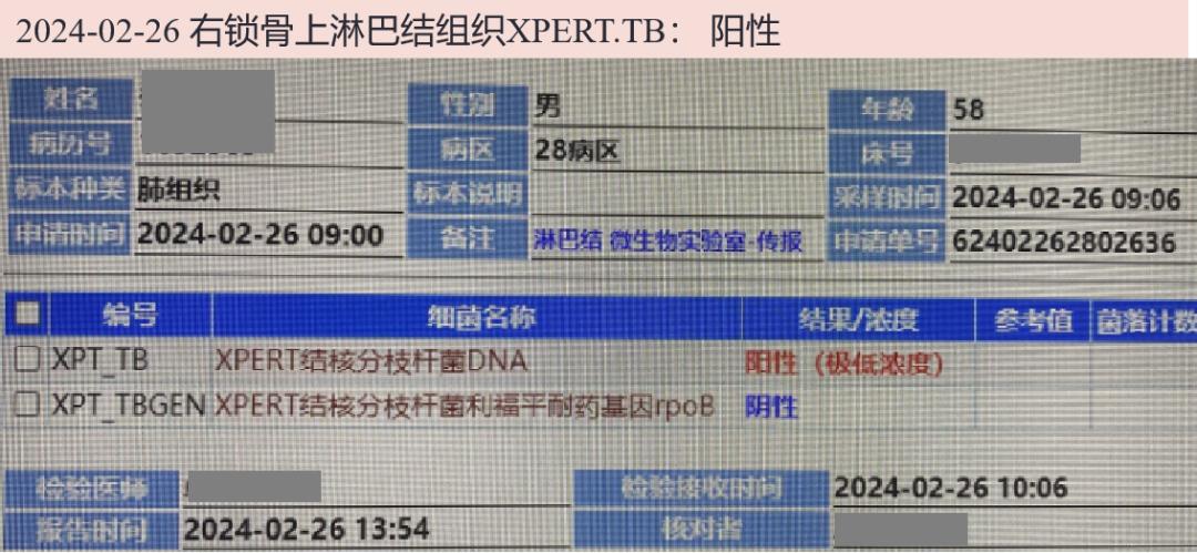 2024-02-26 淋巴结组织涂片找细菌、真菌、抗酸杆菌阴性,组织XPERT.TB:阳性(极低浓度)。