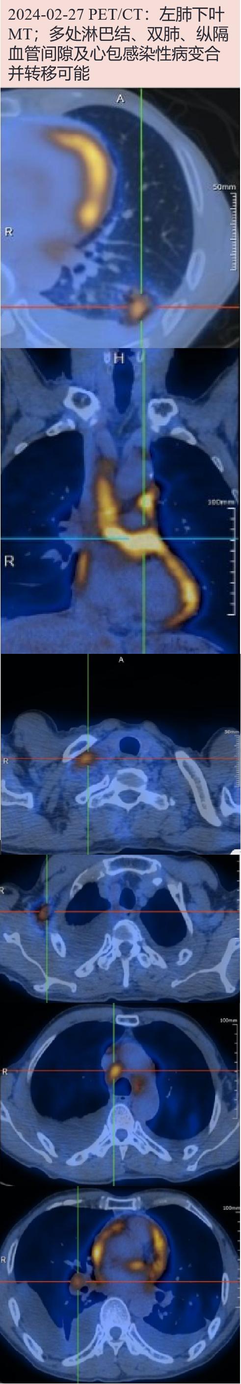 2024-02-27 PET/CT:左肺下叶MT(分叶状实性结节,大小约20.0×17.0mm,SUVmax 7.8);多处(双肺门、纵隔、右侧腋窝、双侧锁骨区及颈部、膈上心周、右侧肋间、腹腔及腹膜后,心包增厚伴糖代谢异常增高,SUVmax10.9;右锁骨区肿大淋巴结大小25.3×14.3mm,SUVmax 5.9)淋巴结、双肺、纵隔血管间隙及心包感染性病变合并转移可能。