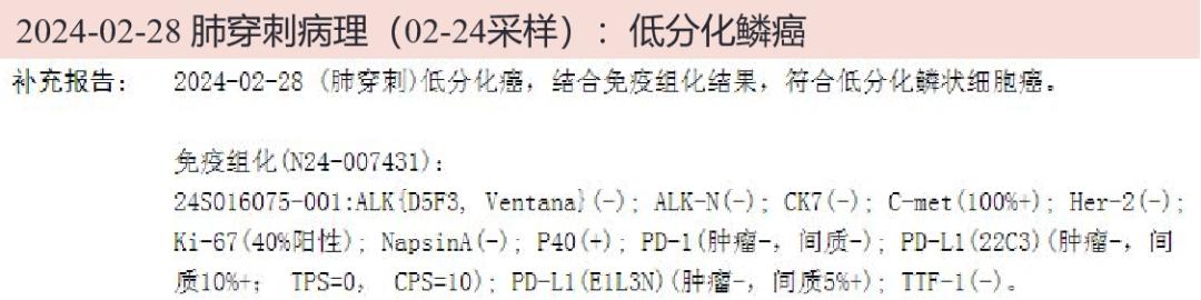 2024-02-28 肺穿刺病理组化及酶标(02-24采样):低分化鳞状细胞癌。