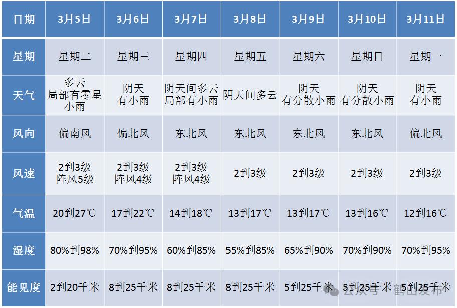 预计今天白天,鹤山阴天,有分散小雨和雾,气温12到20度,东南风2到3级阵风5级 ,相对湿度65%到95%。5日受暖湿气流影响,气温继续回升,天气潮湿;展望,6至7日受新一股冷空气影响,气温下降,早晚体感寒凉。雨雾天气时,能见度较差、道路湿滑,需注意交通安全。(鹤山市气象台03月04日08时40分发布)