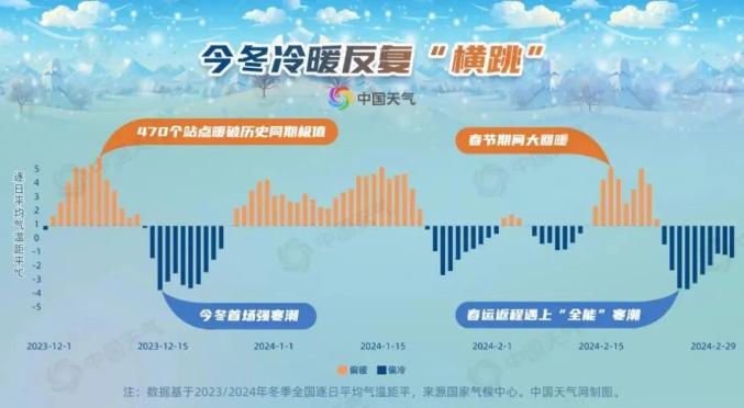 虽然这个冬天的寒意让大家印象深刻,但并不能称之为“冷冬”。根据国家气候中心数据统计,今冬全国平均气温为-2.8℃,较常年同期偏高0.3℃,但全国暖冬指数和冷冬指数均没有达到一半,因此总体来看,2023/2024年冬季(2023年12月1日至2024年2月29日)为正常年份。