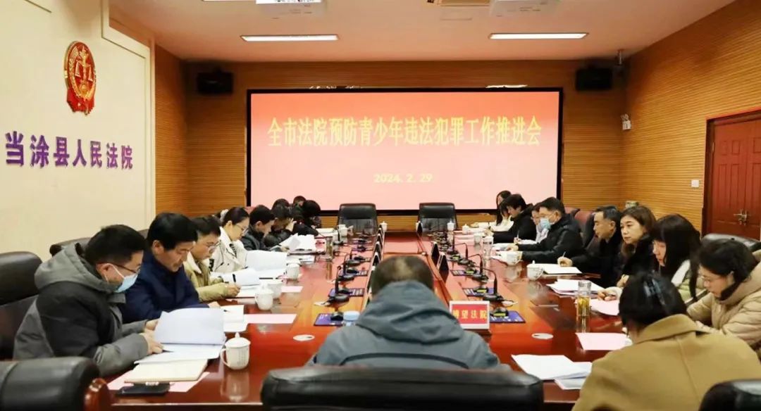 2月29日下午,全市法院预防青少年违法犯罪工作推进会在当涂县法院召开,市中院党组成员、副院长邰玉金出席会议并讲话,市中院民一庭庭长、刑一庭庭长及相关工作人员,各县、区法院分管少年审判工作的院领导、部门负责人参加会议。