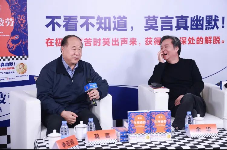 余华:我看到《生死疲劳》书里那个牛最后死的时候,用最后的力气走到田上,那时候我热泪盈眶。看到最后那个猪,把他的那些是孙子们,曾孙子,一个一个从冰下面救起来的时候,我又哭。我很容易掉眼泪,莫言更容易掉眼泪,他看个电视剧都哭。但看《生死疲劳》的大量时间,我又不断地在笑,确实是才华横溢。就像书封说的:“在极度痛苦笑出声来,获得内心深处的解脱”,这个其实用得是很好。