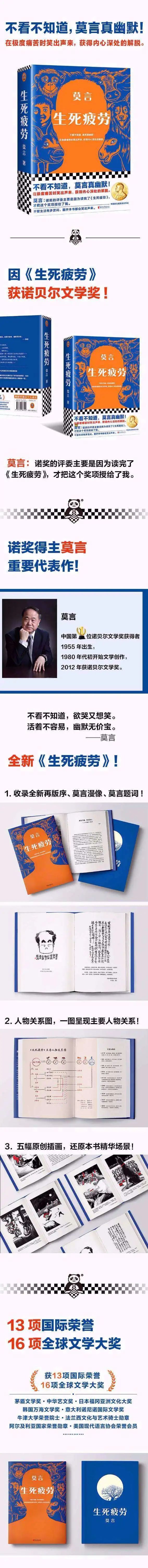 它新鲜、幽默、极端奔放乃至疯狂,让人在极度痛苦时笑出声来,获得内心深处的解脱。莫言也曾透露,“诺奖的评委主要是因为读完了《生死疲劳》,才把这个奖授给了我。”