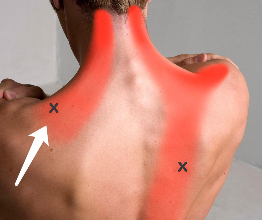 图片来源:giphy各位久坐的打工人、学生党,背部上斜方肌处大概率就有扳机点,可以根据图片标注「X」的位置,用手按着找一找。