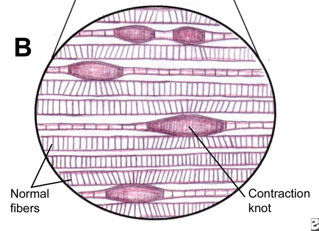 但损伤和炎症等,让一条条肌纤维由中间某段「紧绷挛缩」在一起,甚至复合形成了可以触碰到的结节。