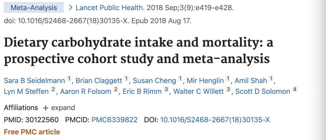 [2]Sara B Seidelmann 1, Brian Claggett 1, Susan Cheng 1, et al, Dietary carbohydrate intake and mortality: a prospective cohort study and meta-analysis, 2018 Sep