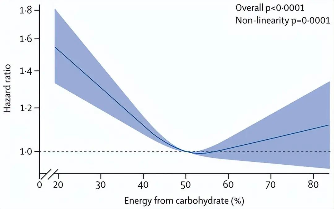 该研究揭示了碳水化合物摄入量与全因死亡率之间的关联。中等碳水化合物饮食(50-55%的能量摄入)与最低的全因死亡风险相关,这意味着人们可以通过控制碳水化合物的摄入量来降低全因死亡的风险。