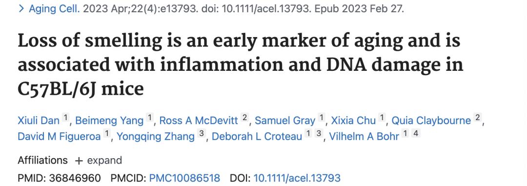 [1]Xiuli Dan 1, Beimeng Yang 1, Ross A McDevitt , et al, Loss of smelling is an early marker of aging and is associated with inflammation and DNA damage in C57BL/6J mice, 2023 Apr
