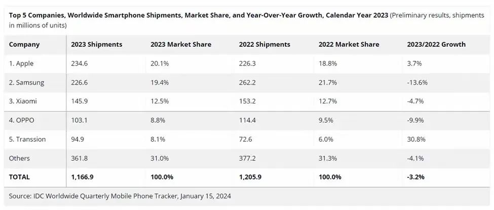 2023年传音年报尚未发布,所以还未披露总体出货量,但是这一年传音在全球智能手机行业的市场排名又有所上升。据IDC数据显示,2023年传音智能手机出货量9490万台,排名全球第五,市场份额8.1%。尤其是第四季度,传音全球智能手机出货量达2820万部,同比增长68.6%,首次跃升至全球第四,超过了OPPO和vivo。