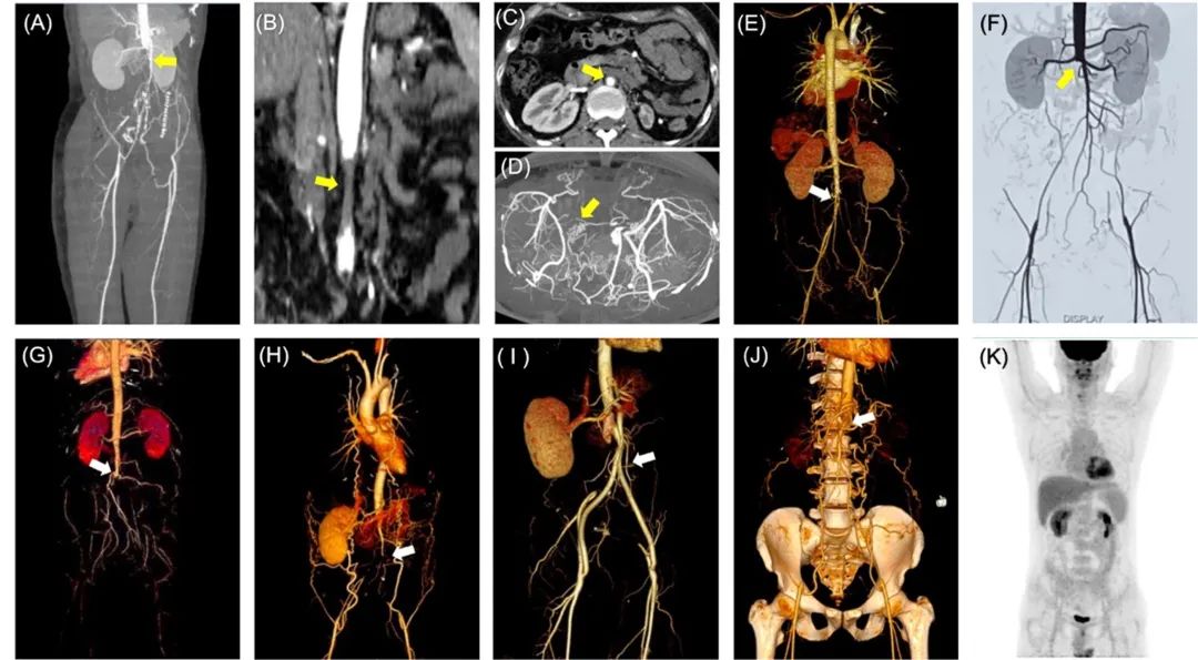 12例CAAOD患者的腹主动脉病变程度各异,包含1例轻度狭窄,3例中度狭窄和8例完全闭塞。病变范围大多起始于肾下腹主动脉,可延伸至髂总动脉,3例患者同时伴有单侧或双侧肾动脉狭窄。研究人员对其中9例患者的腹主动脉CTA影像进行测量,发现平均腹主动脉狭窄病变长达77.46mm,病变最广泛者可超过100mm;除了1例患者存在腔内继发血栓,其余患者血管最狭窄处的管壁在3、6、9、12四个点位方向的厚度基本均匀,且未见显著增厚。此外,1例患者在发病急性期完善了PET-CT评估,检查结果未见血管壁代谢升高。(图2)
