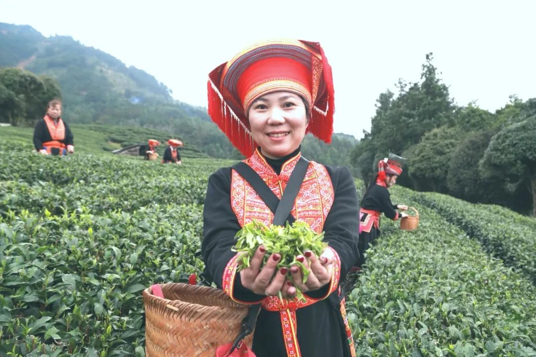 身着艳丽瑶族服装的茶农们