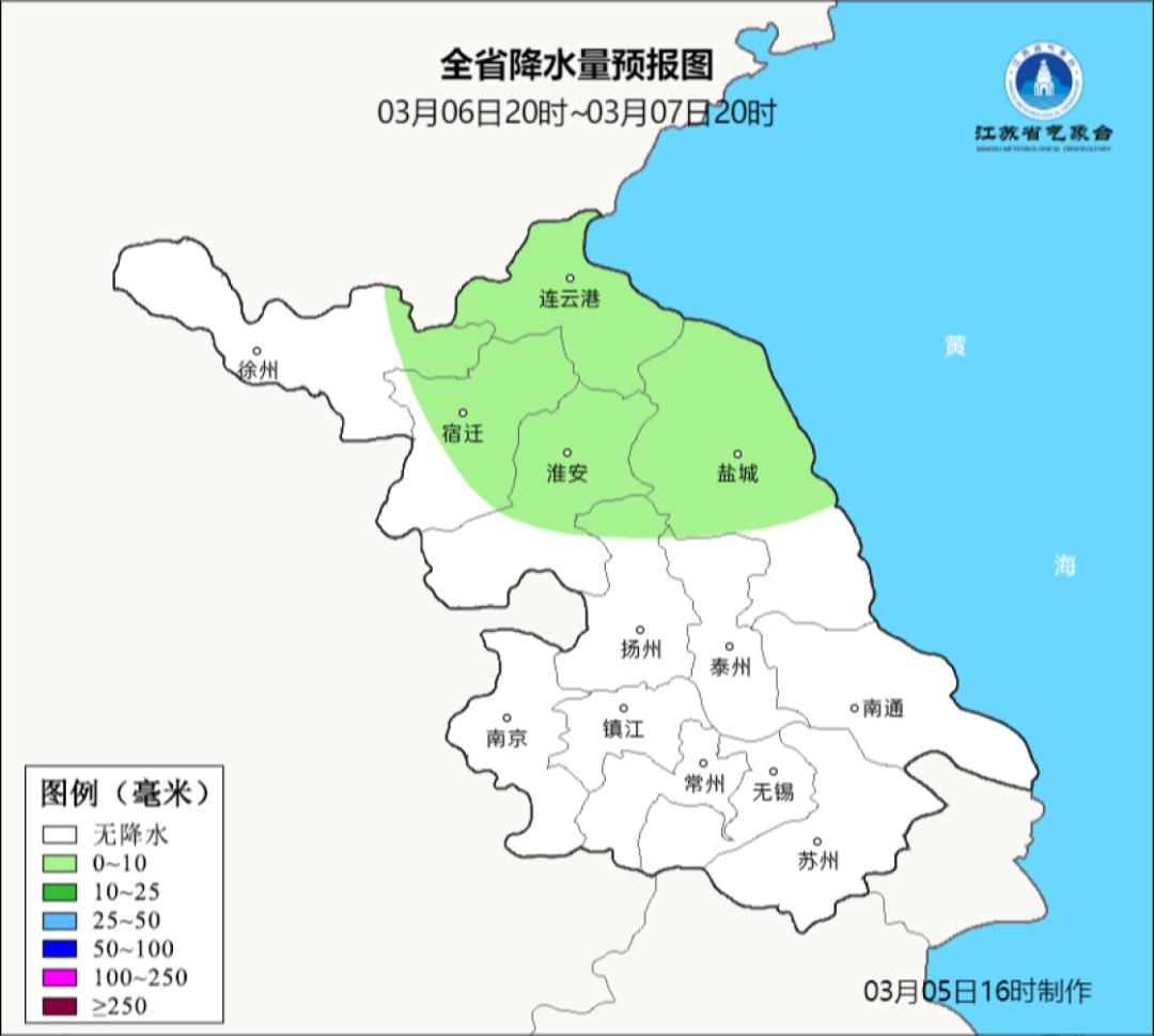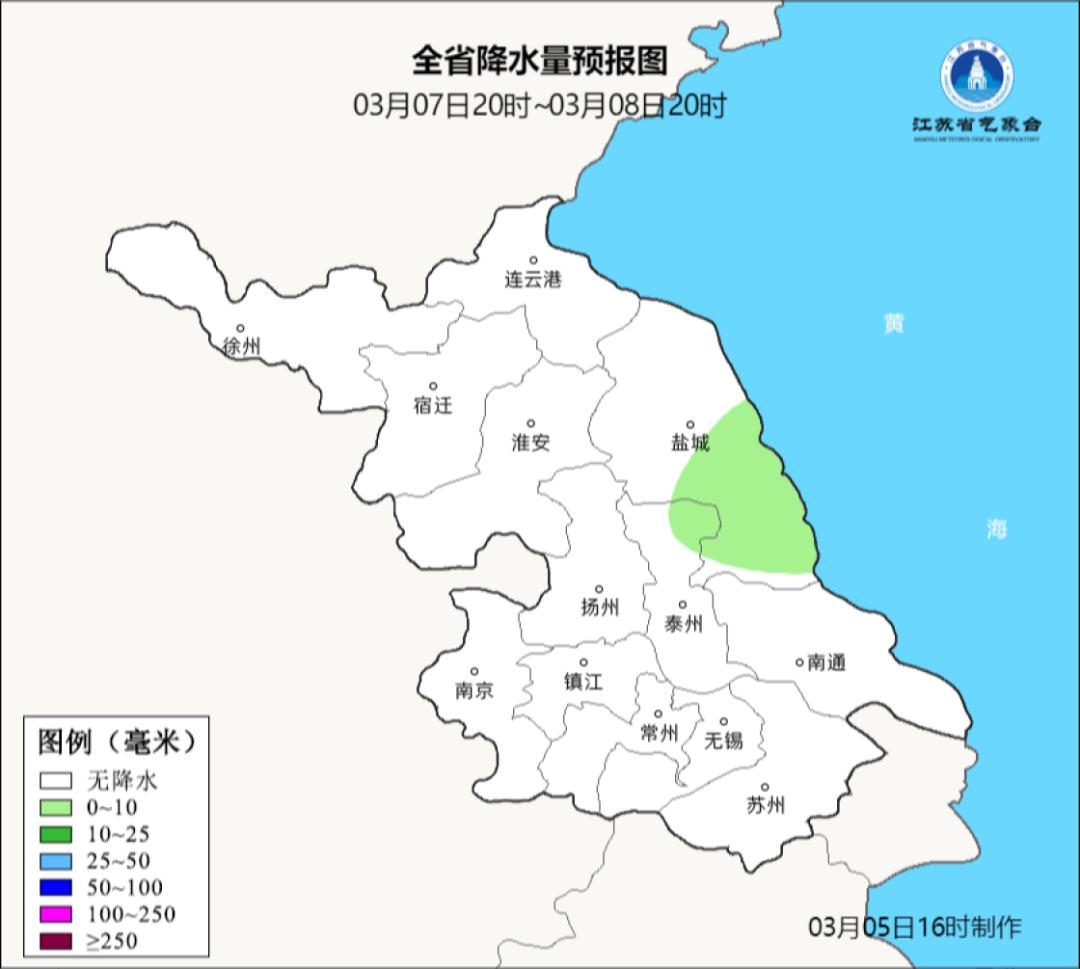 3月7日20时至3月8日20时,江淮之间东部的部分地区阴有阵雨并渐止转多云,其他地区多云。最高温度:全省12℃左右;最低温度:淮北地区-1~-2℃,苏南南部地区3℃左右,其他地区0~1℃。全省偏北风4-5级。