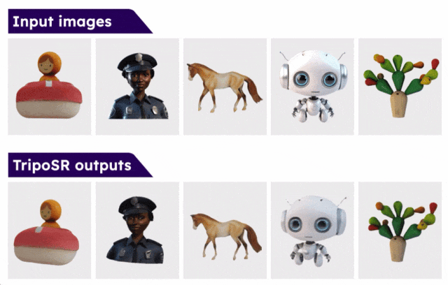 ▲TripoSR输入输出示例据介绍,TripoSR支持较低的推理预算,即使没有GPU也能运行。该模型基于Adobe的三维重建模型LRM构建,主要针对娱乐、游戏、工业设计等行业需求。