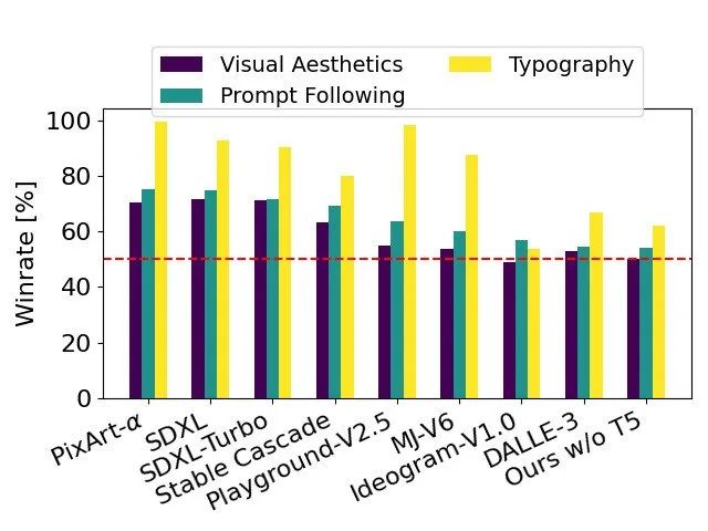 移除 T5 模型后,SD3 模型在视觉美学(图像质量)方面的表现几乎没有变化(胜率保持在 50%),在文本遵循方面的表现略有下降(胜率降至 46%)。 然而,对于生成文本排版方面,性能下降更为明显(胜率降至 38%),这表明 T5 模型在处理复杂文本提示时尤为重要。