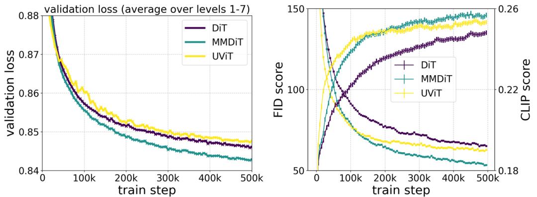 Stability AI 将 MMDiT 架构与现有的文本到图像生成骨干网络(如 UViT 和 DiT )进行了比较。在训练过程中,MMDiT 在视觉保真度和文本对齐方面表现出色,超越了这些已建立的架构。