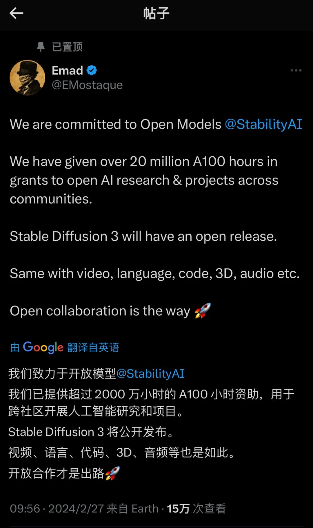 Stability AI 始终把开源开放作为核心战略。在 X 的主页置顶消息上,Emad Mostaque 写道:“我们致力于开放模型,已提供超过 2000 万小时的 A100 资助,用于跨社区开展人工智能研究和项目。Stable Diffusion 3 将公开发布,视频、语言、代码、3D、音频等也是如此。开放合作才是出路。”