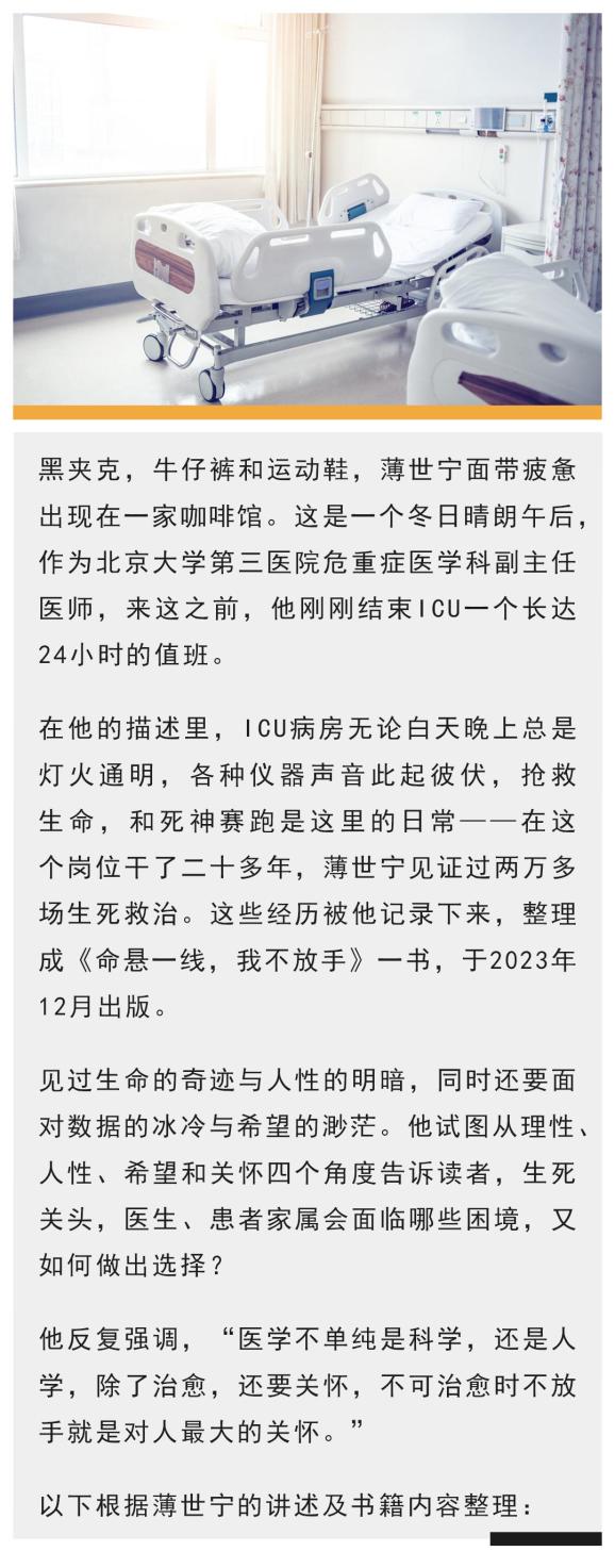 写的过程中,我觉得这个题材或许最适合临床医生来写。在记录生命的震撼和感动时,你要能引发每个人的思考,(遇到类似的情况)怎么决策,怎么活着,怎么被爱,这些都很重要。真实的案例能让人理解什么叫理性、感性,这两者永远不是对立的关系。书中有个82岁的老人,多器官衰竭了,包括肾衰,他的家属就是不放手。最后他的儿子哭着说,能不能把我的肾给我爸?他特别孝顺,穿一件黑色的羽绒服,每天蹲在楼道里面等,楼道多冷啊,都是“嗷嗷”的风,但是等了两个月,他的父亲也没(从ICU)出来。