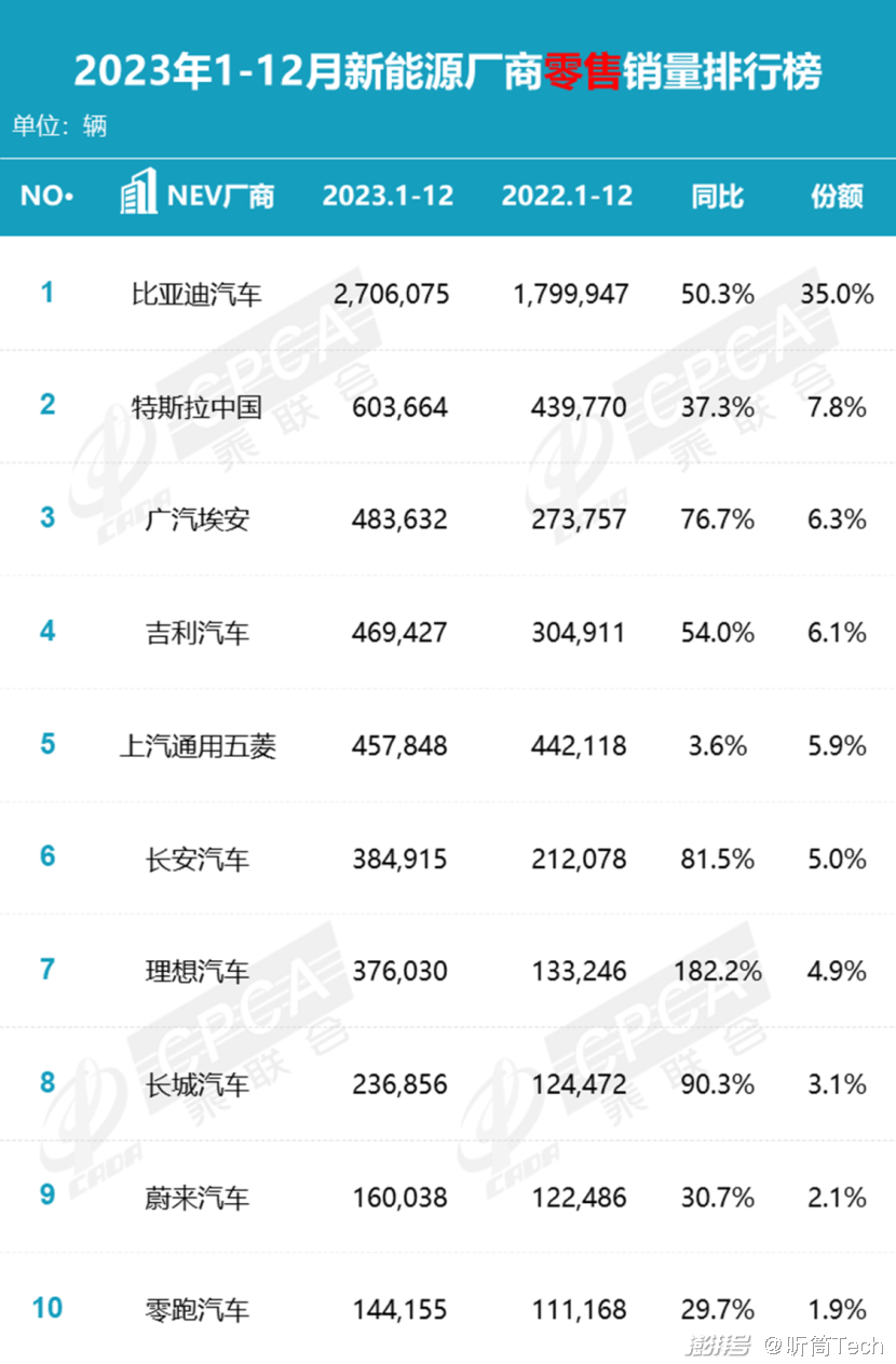 过去的一年里,蔚来的零售销量已经被各大新能源厂商超越,中国乘联会公布的2023年新能源厂商零售销量排行榜中,蔚来排到了第9位。
