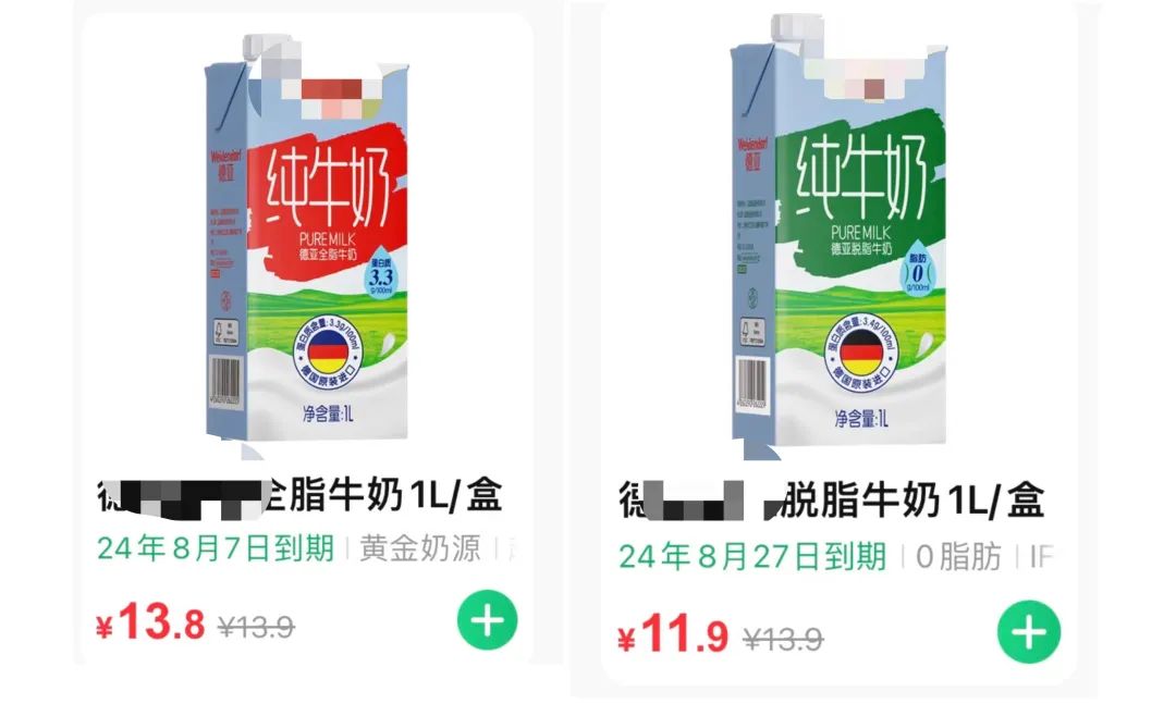 价格差不多的全脂奶和脱脂奶(原价甚至相同)