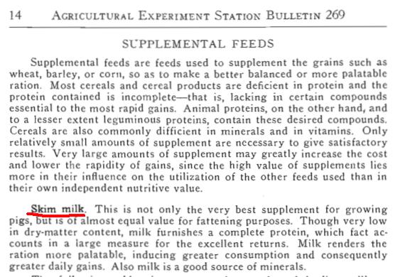 一份1930年的养猪手册里指出,脱脂奶是极好的家猪补充饲料丨Oliver, A. W.; Potter, E. L. (November 1930). "Fattening Pigs for Market"