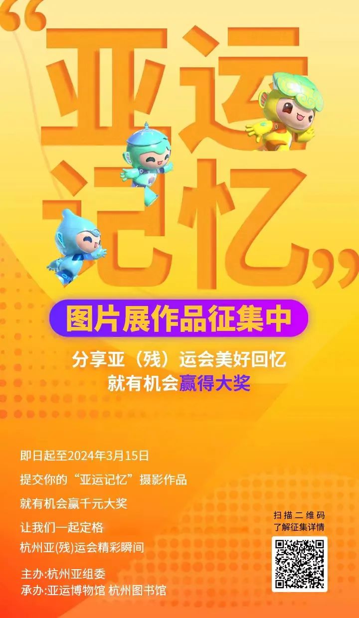 赶紧打开你的相册,来分享你的“亚运记忆”吧!入选后不仅有机会在亚运博物馆、杭州图书馆面向全社会展出,还有机会赢得千元大奖及荣誉证书。