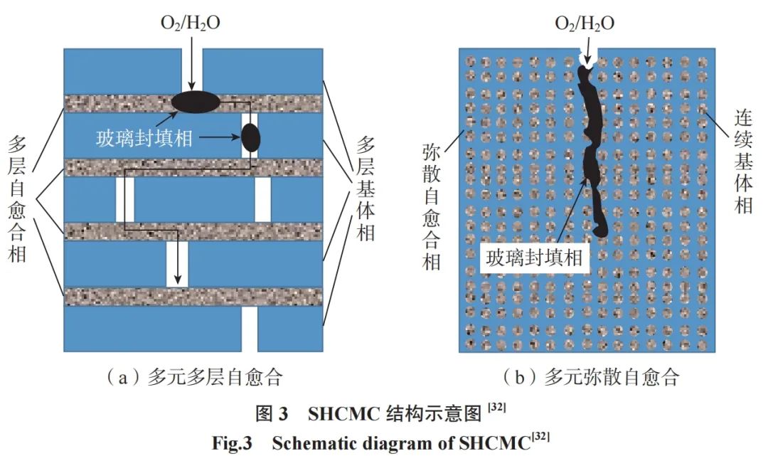 理想状况下,自愈合机制可多次修复损伤,自愈合引入的目的是阻止或限制氧气向材料内部的扩散,自主、重复使用的 SHCMC 可满足许多严苛条件下的使用要求。从结构角度出发,SHCMC 的设计主要包括界面设计和自愈合基体设计两个方面 [20]。