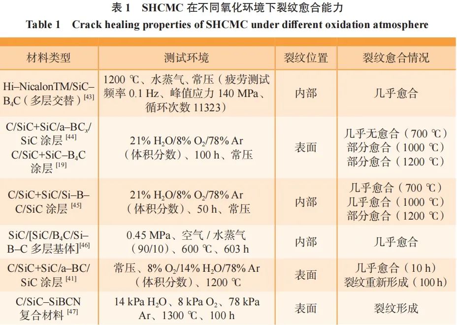 针对含硼 SHCMC 在高温水蒸气环境下裂纹愈合能力较差的缺陷,目前国内外科研人员主要从两方面着手解决:一是设计多层自愈合基体或涂层 [41–46];二是选用高温抗氧化性能更好的 Si–B–C–N 作为自愈合基体 [47–49]。虽然上述优化在一定程度上提高了 SHCMC 内部的裂纹愈合能力,如多层自愈合基体或涂层可使复合材料内部裂纹部分或几乎愈合,但复合材料表面裂纹很难愈合。而 Si–B–C–N 自愈合基体氧化后所形成的 SiO2 氧化层容易析晶,由于SiO2 与基体的热失配,使得表面氧化层易开裂和剥离 [47],因此在循环氧化下,复合材料的整体抗氧化能力同样会显著下降。含硼 SHCMC 在不同氧化条件下的裂纹愈合能力如表1 统计所示。