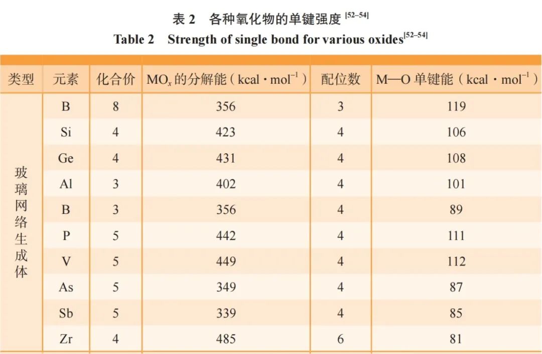 自愈合玻璃相主要由硼 / 硅酸盐玻璃组成,其中硅酸盐玻璃是由硅氧四面体 [SiO4] 以顶点相连而组成的三维架构网络,这些网络不像石英晶体那样远程有序,却是其他二元、三元、多元硅酸盐玻璃结构的基础 [50]。根据无规则网络学说,可将氧化物分为网络生成体氧化物、网络外体氧化物和中间体氧化物 3大类 [51]。不同氧化物的单键强度如表 2 所示 [52–54]。
