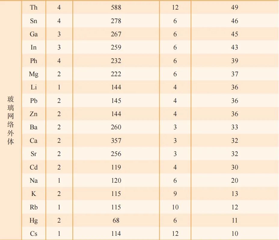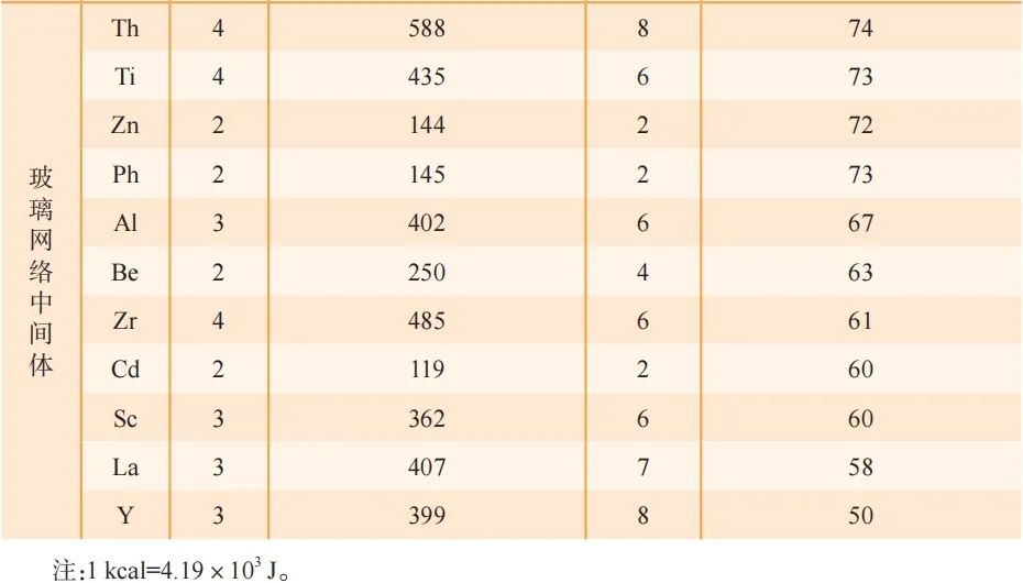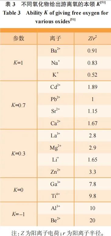 适当网络外体氧化物的加入是产生上述现象的主要原因,会改变氧化硼的结构,吸收游离氧后,硼氧三角体[BO3] 会转变为硼氧四面体 [BO4],其结构从层状转变为框架 [53–54],从而降低 B2O3 在高温下的活度。若加入网络外体氧化物过多,多提供的“游离氧”反而又会破坏 [BO4] 之间的“桥氧”,使得硼酸盐玻璃中的桥氧含量下降,玻璃的稳定性降低,氧化硼的活度升高,而上述现象也被称为“硼反常”现象。虽然适当地加入网络外体氧化物会提高 B2O3 的稳定性,但是这些游离氧的存在也会严重破坏 SiO2 的网络结构,减少 SiO2 熔体中桥氧数量,降低其黏度。表 3[51] 为不同网络外体氧化物给出游离氧的本领。