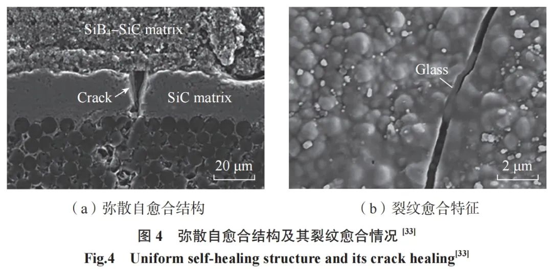 1.2 自愈合基体设计为使基体获得自愈合性能,同样可将含硼化合物引入至基体中,比如B4C,根据复合材料中自愈合组元的分布方式,可将陶瓷基复合材料的基体结构分为多元弥散自愈合和多元多层自愈合两种:(1)多元多层自愈合基体(图3(a)[32])是将 SiC、B4C或 Si–B–C 交替沉积形成层状结构,包裹于纤维表面,如法国 Snecma 公司已成功将具有多元多层自愈合基体的陶瓷基复合材料应用于航空发动机中 [31] ;(2)弥散自愈合结构(图3(b)[32])是 将 含 硼 组 分(如B 单质、B4C 等)以颗粒弥散形式引入至SiC 基体中,当基体出现裂纹时,裂纹附近的含硼组分发生氧化并将裂纹愈合(图4)[33]。Cao 等 [34] 利用浆料浸渍法(Slurry infiltration)将 B4C颗粒引入 Cf /SiC 中,并通过反应熔渗(RMI)制 备 出 致 密 的 Cf /SiC–SiBC 复合材料,考察其在不同温度下(800 ℃、1000 ℃和 1200 ℃)的抗氧化性能。结果表明,Cf /SiC–SiBC复合材料在所考察温度区间氧化后的强度保留率均高于 Cf /SiC。其 中 B2O3 可在相对较低的温度(500~1000 ℃)有 效 发 挥 作 用,而富 SiO2 的玻璃相在相对较高的温度(1000~1500 ℃)下更有效。因此,在氧化气氛中形成的硼硅酸盐玻璃相可在氧化初始阶段有效填充基体裂纹,可极大限制氧气向易氧化的纤维和界面区域的扩散,从而提高复合材料的使用寿命。如在高温空气疲劳测试中(1200 ℃,0.1 Hz,120 MPa),Ruggles-Wrenn 等 [35] 研究发现,具有自愈合基体的 SiC/SiC–B4C 复合材料比 SiC/SiC 复合材料的使用寿命从 ~10 h 大幅提升至 221 h。