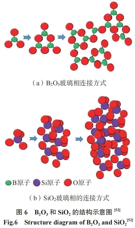 (1)网络生成体氧化物。可单独生成玻璃,在玻璃中能形成特有网络结构。M—O 键(M 代表网络生成离子)为离子、共价混合键,M—O 单键能比较大,一般超过 80 kcal/mol,阳离子(M)配位数一般是 3 或 4,阴离子 O2– 的配位数为 2[51]。单纯含有 SiO2 和 B2O3 的熔体,由于它们的结构差异较大(图6[52],其中前者为框架结构,后者是层状结构),因此不能形成均匀一致的熔体。高温冷却过程中,将会各自富集,形成互不相溶的两相玻璃(分相),因此二者在高温下很难相互限制彼此的挥发。张成弢等 [55] 在研究高温下SiO2–B2O3二元系组元的活度中发现,SiO2 的含量并不会明显引起 B2O3 的活度曲线负偏,B2O3 与 SiO2 的活度曲线近似于理想曲线。