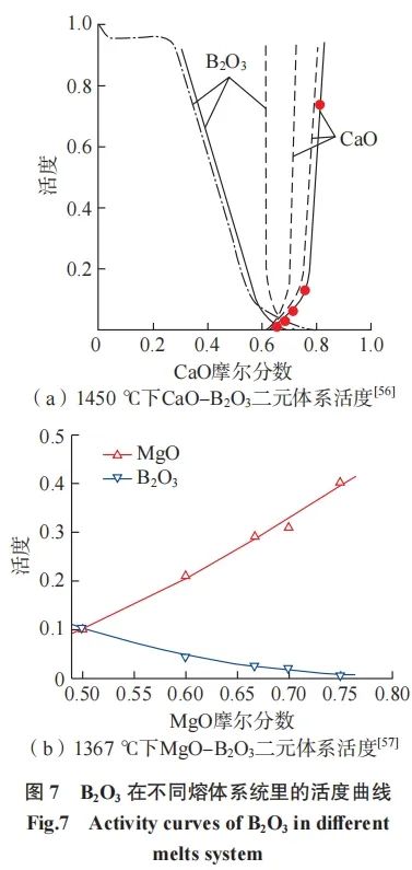 (2)网络外体氧化物。不能单独生成玻璃,不参与玻璃网络结构,一般处于玻璃网络之外。M—O 键(M 代表玻璃网络外离子)主要为离子键,电场强度小,单键能小于 60kcal/mol。因 M—O 键的离子性强,其氧离子 O2– 易摆脱阳离子约束,是“游离氧”的重要提供者 [51]。适量的网络外体氧化物添加会对 B2O3 的挥发起一定限制作用。戴长红等 [56] 测定了 CaO–B2O3 体系中 B2O3 的活度,如图 7(a)所示,随着 CaO 含量的增加,B2O3 的活度曲线存在明显的负偏(试验温度1450 ℃)。Stolyarova等 [57] 在 MgO–B2O3 体系活度研究中发现,MgO 会使 B2O3 的高温活度大幅降低(图7(b))。从上述研究中可以得出结论,网络外体氧化物可降低熔融态下 B2O3 的活度,而 SiO2 对B2O3 的活度不会产生较大影响。