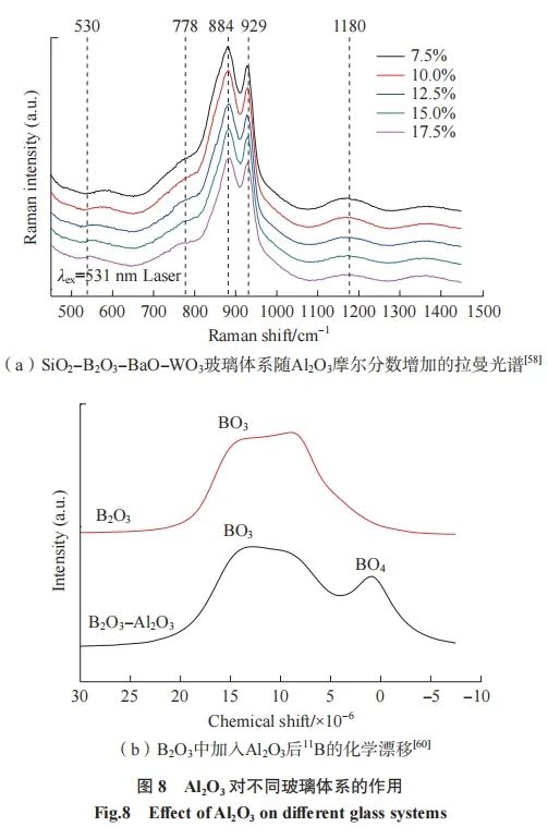 Lee 等 [58] 在固体氧化物电池密封(SOFC)材料的研究中发现,Al2O3 的添加有利于提高硼硅酸盐玻璃的热稳定性,如图 8(a)显示;随着 Al2O3 的加入,含有较多桥氧的 Q2 振动峰有明显增强趋势。Nagai 等 [59] 的 研 究 表 明,B2O3 在Al2O3+B2O3 混合液相中的活度表现出明显负偏(温度为1373~1423 K)。Chu 等 [60] 研究发现,Al2O3 加入至B2O3 中后,[BO4] 的峰开始出现(图8(b)),说明 Al2O3 提高了硼酸盐玻璃的稳定性。Alvari 等 [61] 在 ZrB2–SiC–B4C 的氧化试验中发现,1700 ℃氧化时,由于 ZrO2 的形成,使氧化层变得相对致密。上述研究表明,玻璃中间体氧化物可提高自愈合玻璃相的高温稳定性。