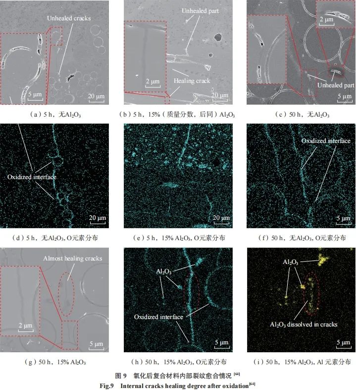 2 现阶段自愈合陶瓷基复合材料面临的挑战无论材料所处何种温度和环境,自愈过程均需首先形成玻璃相,玻璃相在毛细管力的作用下填充基体中的裂纹,填充于裂纹的玻璃相会限制氧气介质向复合材料内部扩散,当沿裂纹的基体成分发生氧化而产生氧气消耗时,这种扩散受到进一步限制。虽然自愈合基体 / 界面在一定温度范围内可有效愈合裂纹,但仍存在一定的局限,例如在空气气氛下,自愈合玻璃相 B2O3 在大于 900 ℃时熔体黏度显著降低并开始挥发,对复合材料的保护作用下降;而 SiC 组元在超过 1000 ℃时才开始氧化,虽然 B2O3 能加速 SiC 的氧化并降低其氧化温度,但初期形成的硼硅酸盐(B2O3–SiO2)的黏度反而会降低,因此氧气在 B2O3–SiO2 玻璃熔体中的扩散速度更快,使复合材料的氧化加速 [36]。随着 B2O3 的不断挥发,玻璃相中 SiO2 含量逐渐增加,熔体的黏度开始上升,对复合材料的保护作用逐渐改善。