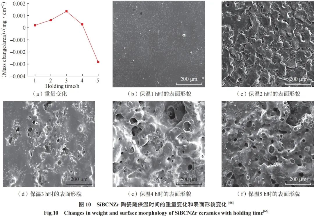 目前为止,已有从提高自愈合玻璃相高温稳定性出发对陶瓷基复合材料自愈合性能进行改善的报道。Shan 等 [62–63] 通过浆料浸渍工艺将Al2O3 引入 SiC/SiC–B4C 陶瓷基复合材料的基体中,研究了改性前后复合材料在 1100~1200 ℃高温水蒸气条件下的氧化行为,发现,Al2O3 可显著限制 SiO2 析晶,且改性后的 SiC/SiC–B4C 陶瓷基复合材料氧化层更加光滑致密;进一步对复合材料进行预制裂纹后发现,经 Al2O3 改性后的陶瓷基复合材料的表面裂纹和内部裂纹可迅速愈合(图9[64]),且复合材料氧化后的强度保留率显著提高,与此同时,短期氧化时,Al2O3 改性后复合材料氧化层表面依然可检测到 B2O3 的存在。Miao 等 [65–66] 利用溶胶凝胶法制备了 SiBCNZr 陶瓷,研究了其在 1500 ℃的抗氧化性能,研究结果表明,随着氧化时间延长,由于 B2O3 的挥发会在氧化层中形成许多小孔,ZrSiO4 的形成可以有效抑制 SiO2 玻璃相的挥发(图10)。Luan 等 [67] 通过 CVI 工艺制备了 C/SiC–SiHfBCN 复合材料,并研究了其在 1200~1400 ℃水蒸气条件下的自愈合能力,由于 HfSiO4 的形成,使得 SiO2–HfO2 玻璃体系的黏度和热稳定性得以提升,提高了复合材料的自愈合性能。